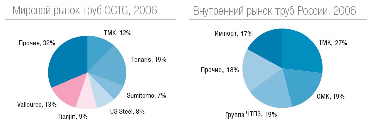 Трубная металлургическая компания является лидером по производству трубной продукции на территории России и стран бывшего СССР, а также одним из ведущих игроков мирового рынка труб, где занимает третью позицию после Tenaris и Vallourec. При этом отметим, что доля ТМК в сегменте наиболее рентабельной и прибыльной продукции - бесшовных нарезных труб нефтегазового сортамента (OCTG) - довольно высока и достигает 12%.