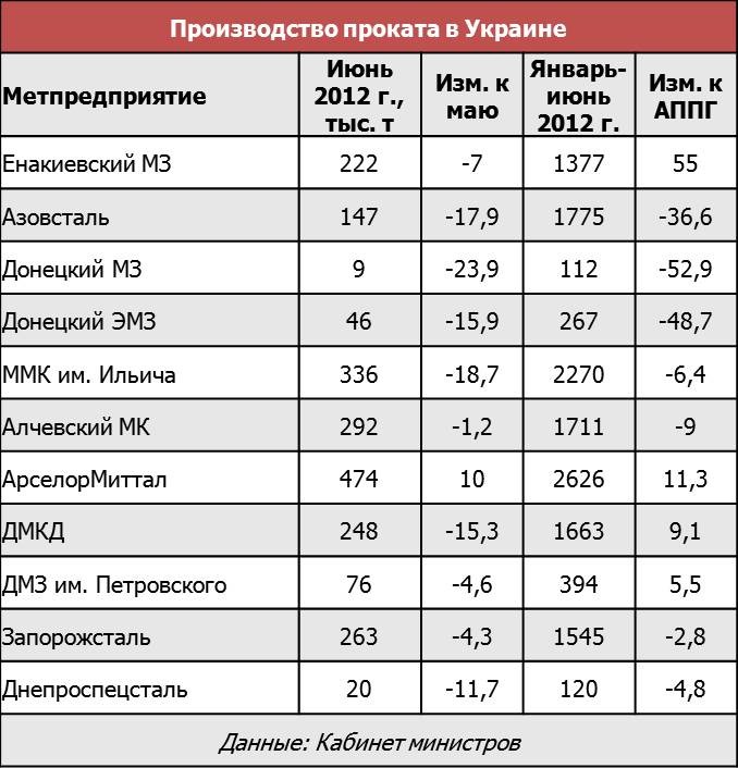 По данным Кабинета министров, по итогам первого полугодия в Украине произведено 14,174 млн. т проката, что на 5,7% меньше показателя 2011 г. В то же время в июне украинские металлурги на 5,7% в сравнении с маем снизили выпуск проката, который составил 2,197 млн. т. Снижение июньских показателей наблюдалось абсолютно на всех крупнейших метпредприятиях страны за исключением лишь "АрселорМиттал Кривой Рог", на котором по итогам июня зафиксирован 10% рост в месячном исчислении. Так, наибольшее падение производства отмечалось на Донецком МЗ (-23,9%), ММК им. Ильича (-18,7%) а также на комбинате Азовсталь (-17,9%).