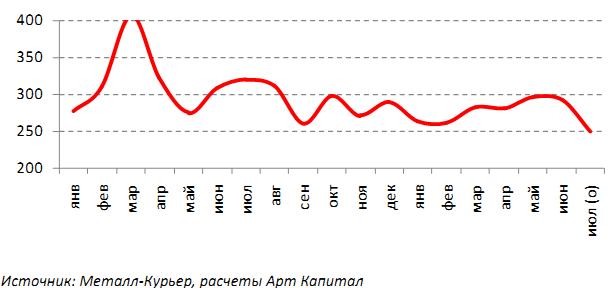 Алчевский меткомбинат намерен снизить выпуск проката на 15% м/м, до 250 тыс. т в июле, говорится в обзоре инвесткомпании "Арт Капитал" со ссылкой на "Металл-Курьер".