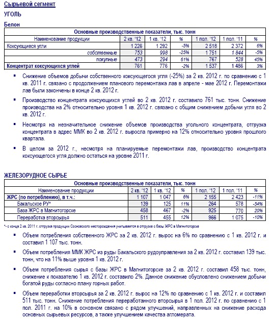 Общее производство товарной продукции в Группе ММК за 2 кв. 2012 г. составило 3 062 тыс. тонн (+1,4% к 1 кв. 2012 г.).