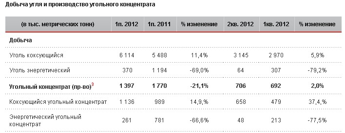 Добыча коксующихся углей в первом полугодии 2012 года увеличилась на 626 тыс. тонн (+11,4%) по сравнению с аналогичным периодом прошлого года и составила 6 114 тыс. тонн. Такой результат был обусловлен увеличением на 827 тыс. тонн добычи коксующегося угля на американских шахтах United Coal Company ("United Coal"), в то время как добыча на украинских шахтах компании Краснодонуголь сократилась на 201 тыс. тонн.