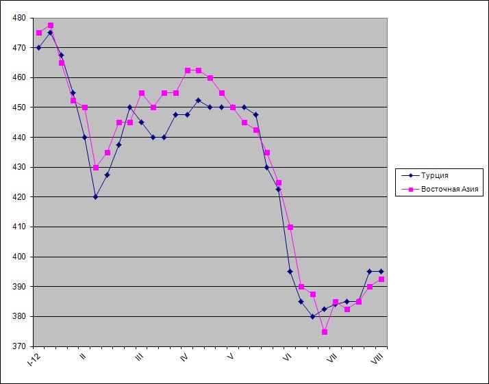 В конце июля турецкие покупатели, игнорируя предложения американских трейдеров, отдавали предпочтение материалу из Западной Европы. Однако и он к концу месяца пошел вверх, чему способствовали как стабилизация регионального рынка длинномерной стальной продукции, так и некоторое укрепление евро по отношению к доллару. Цены на европейский материал HMS № 1&2 (80:20), большую частью июля державшиеся в интервале $370-380 за т CFR, сначала подтянулись вплотную к верхней границе, а в конце месяца и превысили ее, приблизившись к отметке $390 за т CFR. Стоимость черноморского лома А3, в свою очередь, подошла к $380 за т CFR.