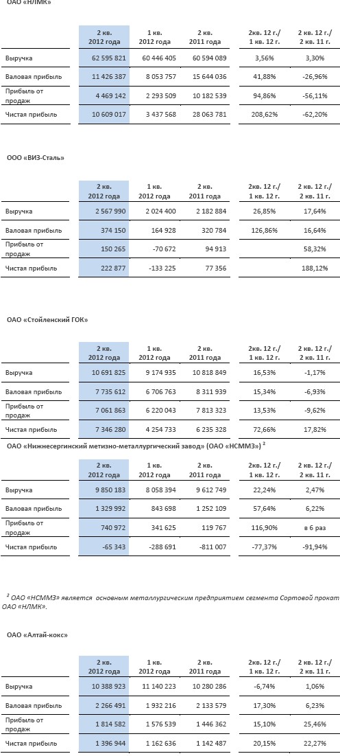 Финансовые результаты ОАО "Новолипецкий металлургический комбинат" и его основных российских дочерних предприятий за 2 квартал 2012 года по РПБУ.