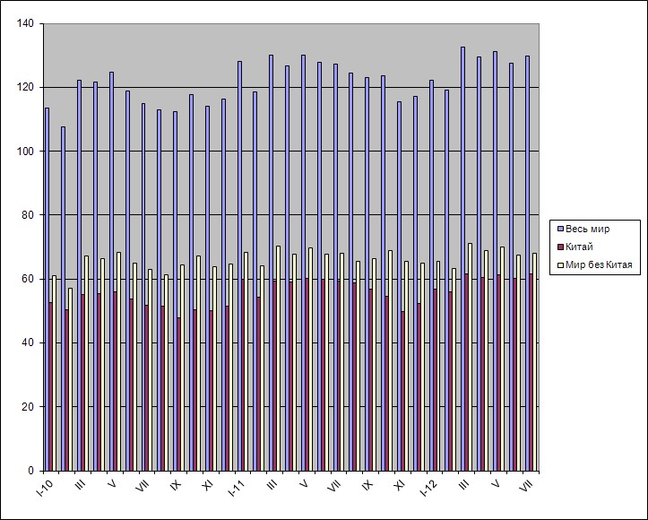 Как сообщает World Steel Association (WSA), в июле 2012 года глобальный объем выплавки стали (без учета нескольких стран, не подающих свои данные в эту организацию) составил 129,7 млн. т, что на 1,7% превысило июньские показатели и на 2,0% ? результат июля 2011 года. Уровень загрузки мощностей в мировой металлургической отрасли, правда, по оценкам WSA, уменьшился до 78,7% по сравнению с 80,4% в июне ? самого низкого значения с января текущего года, однако, судя по нынешней ситуации на рынке стали, этого сокращения недостаточно, чтобы стабилизировать спрос и предложение в мировом масштабе. Всего за первые семь месяцев текущего года в мире было выплавлено 895,4 млн. т стали, на 1,0% больше, чем год назад.