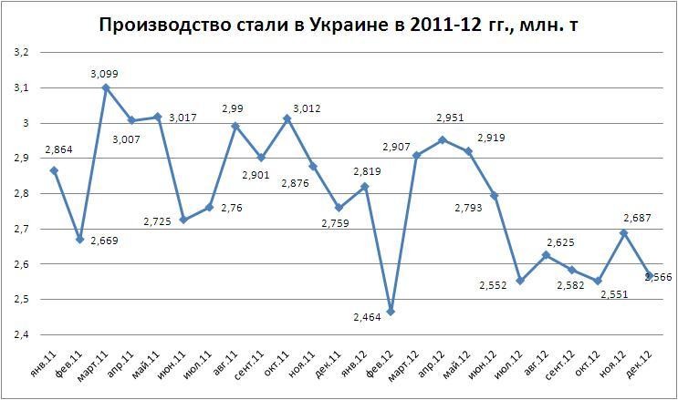 В 2012 г. украинское производство стали сократилось на 6,6%