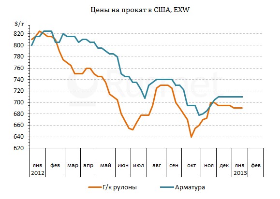 По сообщениям металлургов, американские потребители стальной продукции в последние несколько недель не проявляли активности, а дистрибуторы по-прежнему стараются поддерживать складские запасы на минимальном уровне. Слабый спрос препятствует увеличению стоимости стальной продукции в США. Характерно, что с начала текущего года никто из крупных металлургических компаний не объявлял о готовящихся повышениях. Наоборот, корпорация Nucor, крупнейший производитель длинномерного проката в стране, установила ориентир для прочих участников рынка, заявив о неизменности своих котировок в январе и феврале.