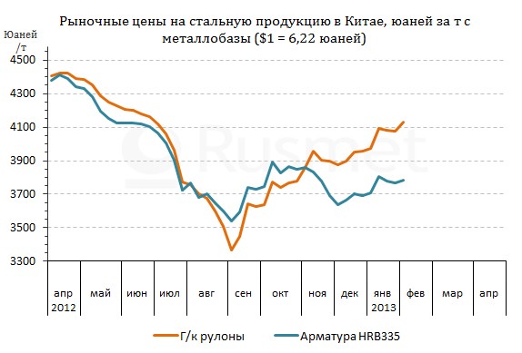 В конце января на китайском рынке стали возобновился рост цен. Рыночная стоимость горячекатаных рулонов достигла максимального уровня за семь месяцев. Текущие котировки на арматуру относительно невысоки в силу благоприятных погодных условий, но на Шанхайской фьючерсной бирже их уровень впервые с июня прошлого года превысил отметку 4100 юаней ($659) за т.
