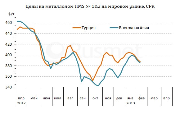 Одновременное сокращение спроса на металлолом на всех основных рынков стало неожиданностью для поставщиков и помогло потребителям сбить цены на сырье до нужного им уровня. Так, в первую неделю февраля в Турции заключалось немало сделок на приобретение лома, но по все более выгодным для покупателей ценам. Котировки на американский и европейский материал HMS № 1&2 (80:20) сократились от более $400 за т CFR в середине января до $385-390 за т CFR.