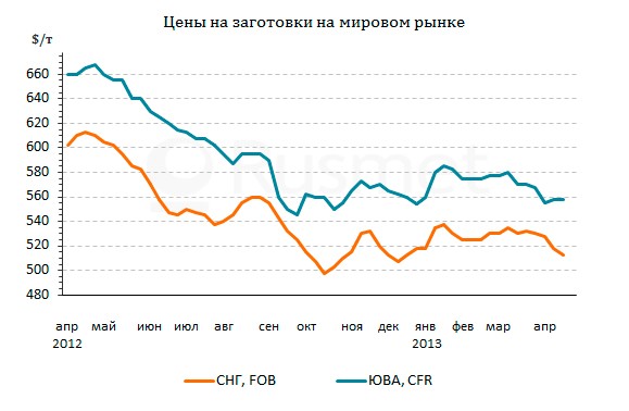 В первой половине апреля направление этих колебаний однозначно складывалось в сторону понижения. С начала месяца стоимость заготовок производства СНГ сократилась, по меньшей мере, на $15 за т. Если апрельская продукция продавалась, в основном, по $525-535 за т FOB, то при заключении майских контрактов производителям пришлось опустить котировки до $510-520 за т FOB, а некоторые сделки, в частности, с белорусскими заготовками, заключались из расчета менее $510 за т FOB.
