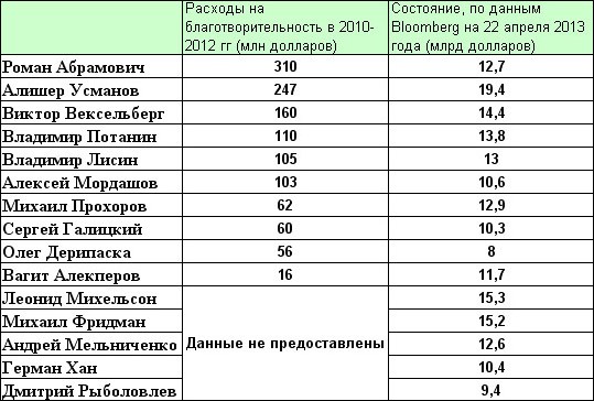 За ним следуют глава "Северстали" Алексей Мордашов (103 млн долларов), президент фонда ОНЭКСИМ Михаил Прохоров (62 млн долларов), совладелец розничной сети "Магнит" Сергей Галицкий (60 млн долларов), глава "РусАла" и владелец"Базового элемента" Олег Дерипаска (56 млн долларов) и глава ЛУКОЙЛа Вагит Алекперов (16 млн долларов). Как сообщает Bloomberg, пять из 15 самых состоятельных бизнесменов России не предоставили информации о своих благотворительных инициативах.