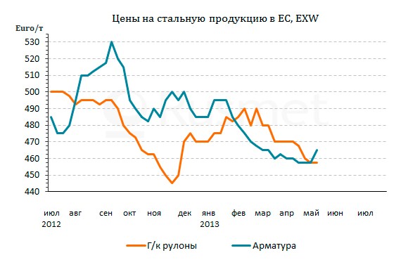 Р’СЃРµ негативные процессы, наблюдавС?иеся РЅР° европейском рынке стали РІ первом квартале, продолжали развиваться Рё РІ апреле. Р’ конце РїСЂРѕС?лого месяца Рё РІ начале мая котировки РЅР° стальную продукцию РІ регионе СЃРЅРѕРІР° РїРѕС?ли РІРЅРёР·. Единственным исключением РёР· правила стал внезапный скачок цен РЅР° длинномерный прокат РІ Р?талии, вызванный пробуждением интереса Рє закупкам продукции СЃРѕ стороны местных потребителей. Однако этот подъем может оказаться кратковременным, поэтому цены РЅР° арматуру, достигС?РёРµ Рє началу второй декады мая отметки 450-460 евро Р·Р° С‚ EXW против 435-450 евро Р·Р° С‚ РІ апреле, РјРѕРіСѓС‚ РІСЃРєРѕСЂРµ вернуться РЅР° прежний уровень.