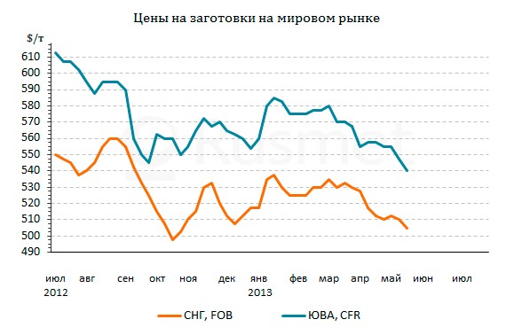 В странах Восточной Азии серьезной проблемой стала демпинговая политика со стороны японских компаний. Из-за крайней слабости регионального рынка длинномерного проката они переориентировались на экспорт полуфабрикатов. При этом, рекордно низкий курс иены по отношению к доллару более чем за три с половиной годы позволяет поставщикам указывать низкие цены – не более $530 за т CFR. В начале мая корейские компании пытались предлагать заготовки в Юго-Восточную Азию по $545-550 за т CFR, а в середине месяца с аналогичными предложениями вышли и российские экспортеры, но в итоге и тем, и другим пришлось сбавлять цены до около $540 за т CFR. Поскольку металлолом в Азии также продолжает понижение, очевидно, что и заготовкам, судя по всему, предстоят новые потери.
