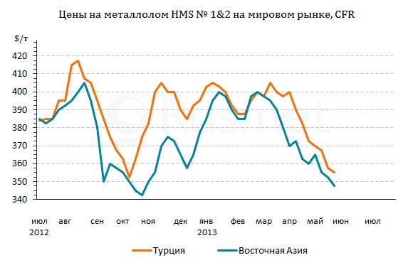 В течение мая котировки на лом в США и западноевропейских странах сократились, в среднем, на $20 за т, однако в июне эти рынки, очевидно, ожидает еще одно понижение. Из-за тяжелого положения в строительной отрасли реальный внутренний спрос на лом в западных странах, скорее всего, возрастет лишь в минимальной степени. При этом, американские и европейские металлурги, очевидно, будут ориентироваться на стоимость лома на внешних рынках.