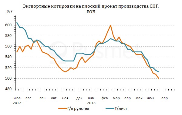 Проблема экспортеров заключается в том, что и на других рынках ситуация не лучше. В Европе в первой половине июня плоский прокат резко подешевел. Поэтому российским и украинским поставщикам тоже пришлось опустить котировки на горячекатаные рулоны до около $520-540 за т DAP. В странах Персидского залива многие покупатели в середине июня уже ушли с рынка, а цены на китайскую, индийскую и корейскую продукцию упали к настоящему времени до $540-560 за т CFR. Поэтому горячий прокат из СНГ местные дистрибуторы готовы приобретать не более чем по $480-500 за т FOB.