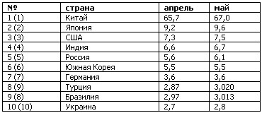 Согласно данным World Steel Association, десятка ведущих стран-производителей стали в мае 2013 г. претерпела изменения.