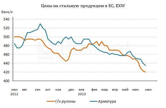 Падение курса евро по отношению к доллару после того как руководство Федеральной резервной системы США объявило о возможном сворачивании программы по выкупу гособлигаций у национальных банков к концу текущего года, как ни странно, помогло европейским металлургам приостановить снижение котировок на стальную продукцию на региональном рынке. Хотя цены продолжали скользить вниз до самого конца июня, как сами металлурги, так и большинство аналитиков предполагают, что спад все-таки подошел к концу.