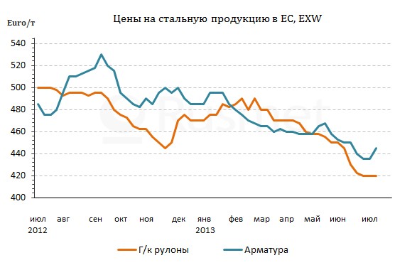 Во второй половине июля ожидается и увеличение экспортных котировок на европейскую арматуру и катанку. В июне цены на эту продукцию падали из-за отсутствия интереса у алжирских компаний – крупнейших импортеров европейского длинномерного проката. Распродажа остатков июльской арматуры в начале текущего месяца вообще осуществлялась по 425-430 евро за т FOB. Но созданные еще в мае запасы продукции у алжирских потребителей подходят к концу, так что металлурги рассчитывают на реванш.