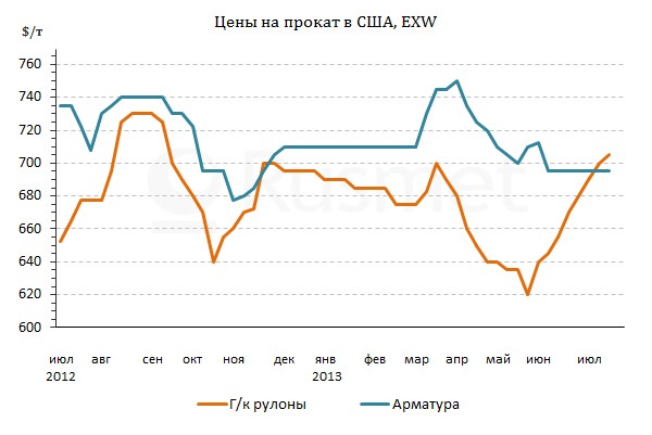 Очевидно, немалую роль играет на американском рынке длинномерного проката конкуренция с импортом. В первой половине июля покупателями предлагалась китайская катанка по $570-580 за т CFR и турецкая арматура по $590 за т CFR, что более чем на $100 за т дешевле, чем у национальных производителей. Не удивительно, что с весны по рынку ходят слухи о возможном возбуждении антидемпингового иска против турецких поставщиков арматуры. Правда, турецкие металлурги на это заявляют, что не занимаются демпингом и продают свою продукцию на экспорт практически по тем же ценам, что и на внутреннем рынке, но опасность введения ограничений, безусловно, остается реальной.