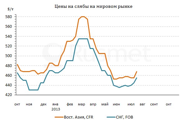 Повышение котировок на плоский прокат в странах Восточной Азии в конце июня – начале июля позволило производителям и потребителям товарных слябов выйти из тупика. Тайванские и корейские компании, которые в июне выставляли встречные предложения на уровне не более $430-440 за т CFR, что было совершенно неприемлемо для поставщиков, пошли на уступки.