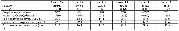 В то же время, в 1 полугодии 2013 г. ArcelorMittal сократил чистый убыток по сравнению со 2 полугодием 2012 г. почти в 4 раза, до $1,125 млрд. Январь-июнь прошлого года компания закончила с чистой прибылью в размере $1,108 млрд.