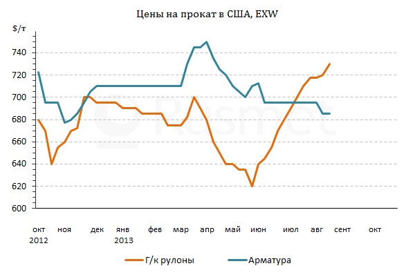 Отстает пока что только длинномерный прокат, что обусловлено отсутствием положительных изменений в инфраструктурном, промышленном и коммерческом строительстве. К тому же, в августе в США немного подешевел металлолом. Стоимость арматуры на местном рынке в результате уменьшилась, в среднем, на $10 за т по сравнению с июнем-июлем и составляет около $670-690 за т EXW. Низкоуглеродистая катанка строительного назначения оказалась более устойчивой, сохранив свой прежний интервал – $705-730 за т EXW.