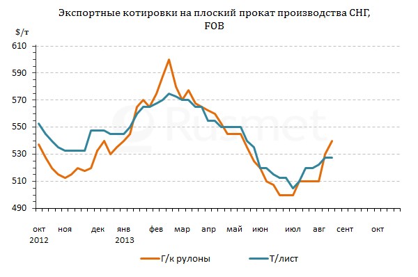 Рост котировок на продукцию российских и украинских металлургов основывается, прежде всего, на ожиданиях всеобщего подъема в начале осени по всему мировому рынку плоского проката. В частности, восточноазиатские компании тоже увеличивают стоимость своей продукции для ближневосточных покупателей. В середине августа горячекатаные рулоны из Китая, Японии, Кореи и Индии находились примерно на одном и том же уровне – $570-590 за т CFR, что на $10-20 за т превышает июльские показатели. На этот интервал ориентируются и поставщики из стран СНГ.