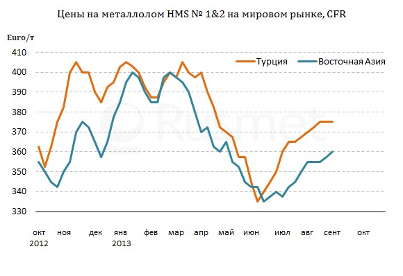 Уровень покупательской активности в Азии в течение всего августа оставался относительно низким, но цены на металлолом постепенно ползли вверх. Этому способствовало, в первую очередь, подорожание в Китае и Японии. На китайском рынке стоимость лома увеличивалась параллельно росту котировок на железную руду, с одной стороны, и готовую стальную продукцию, с другой. В конце августа цены на материал, аналогичный HMS № 1&2 (80:20), достигли $430-445 за т с доставкой, включая НДС. Поэтому китайские компании готовы приобретать американское сырье примерно по $360-365 за т CFR.