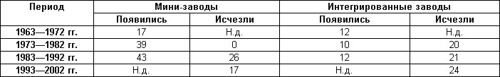 Пока мини-заводы конкурировали с комбинатами, это позволяло первым иметь 27%-ную прибыль с тонны (на 20% выше рыночной). Но как только в 1979 г. с рынка ушли комбинаты, мини-заводы начали конкурировать друг с другом, в результате чего их доход упал до начальных рыночных в 7% с тонны.