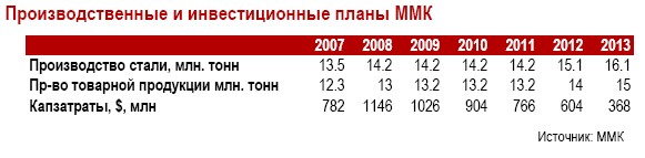 В минувшую пятницу Совет директоров ММК утвердил новую стратегию развития комбината на период с 20072013 гг., после чего состоялась телефонная конференция с участием менеджмента комбината, на которой были озвучены некоторые подробности этой программы Новая инвестпрограмма комбината предусматривает инвестиции в течение этого периода на уровне $5,596 млрд. Благодаря этим инвестициям, объем производства стали на ММК возрастет с 12,5 млн. тонн в 2006 году до 16,1 млн. тонн в 2013 году. Производство товарной продукции увеличится с 11,3 млн. в 2006 году тонн до 15 млн. тонн в 2013 году.