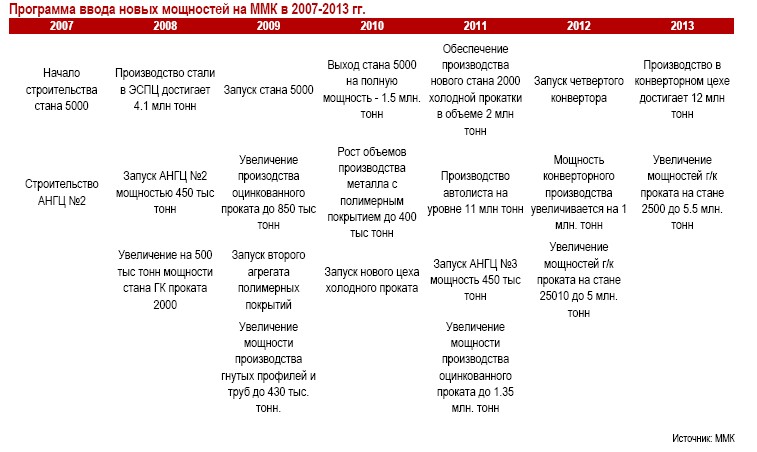 Важно подчеркнуть, что новая программа капвложений ММК и озвученная производственная программа ММК до 2013 года пока учитывают только развитие производственной площадки в Магнитогорске и не учитывают планы зарубежной экспансии ММК.