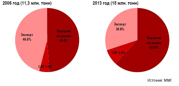 Что касается переориентации ММК на внутренний рынок, то эта тенденция наблюдается уже несколько последних лет еще пять лет назад ММК продавал в России всего около 36% произведенной продукции. По итогам же 2006 года на российский рынок комбинат направил около половины произведенного проката. Уже к 2013 году долю поставок продукции на российский рынок планируется увеличить до 62%.